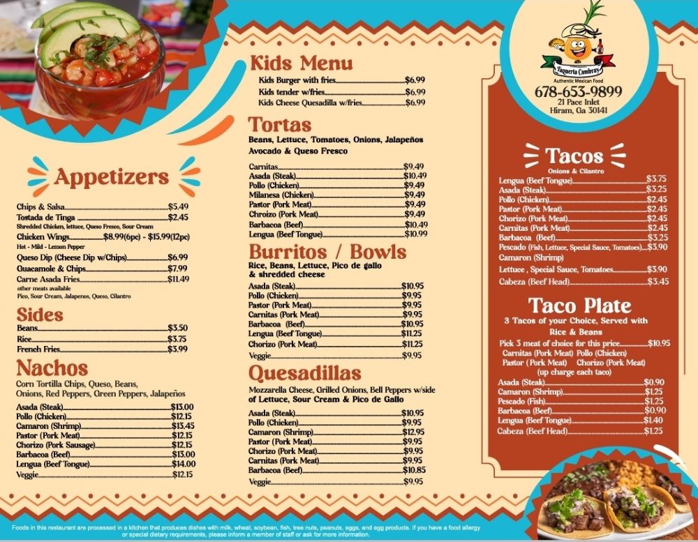 Welcome to Taqueria Cambray, a delightful destination in Hiram, GA, known for its authentic Mexican fare. This vibrant taqueria specializes in seafood, traditional desserts, and classic Mexican dishes, ensuring a gastronomic journey that satisfies craving for genuine flavors.